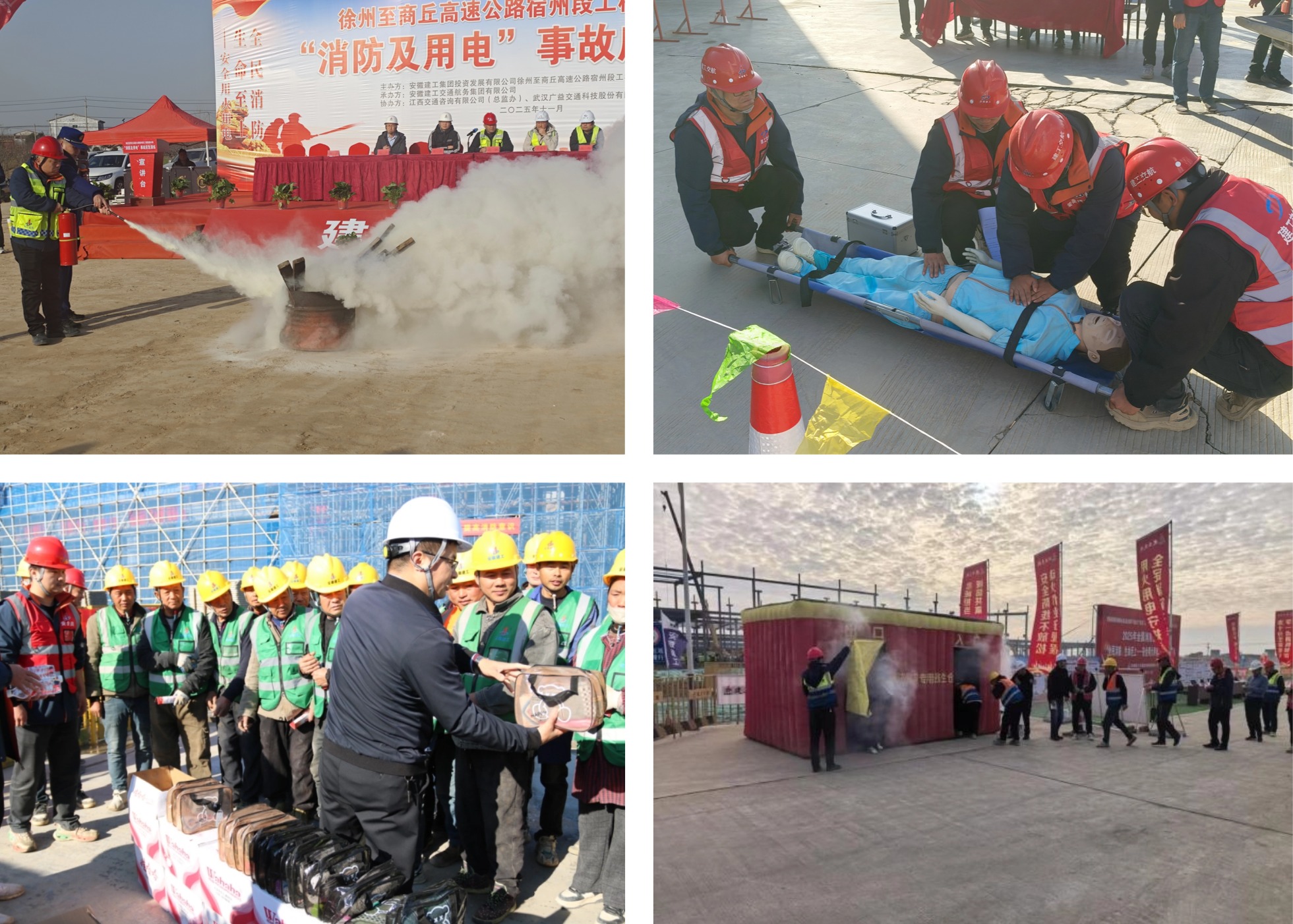 各項(xiàng)目聚焦實(shí)操能力提升,以場(chǎng)景化模擬強(qiáng)化實(shí)戰(zhàn)效果。阜南縣科技創(chuàng)新產(chǎn)業(yè)園二期項(xiàng)目、蒙城縣新型城鎮(zhèn)化食品及農(nóng)副產(chǎn)品加工產(chǎn)業(yè)園項(xiàng)目、徐商高速03標(biāo)項(xiàng)目、S18 寧合高速項(xiàng)目等先后開展消防應(yīng)急演練,模擬不同火災(zāi)場(chǎng)景,開展滅火器實(shí)操、煙霧環(huán)境疏散、救生屋沉浸式體驗(yàn)、觸電應(yīng)急處置等多樣活動(dòng),強(qiáng)化全員應(yīng)急技能與處置能力提升。